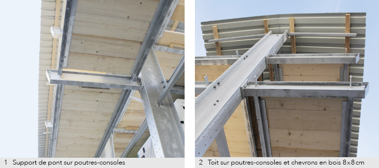 Les toits fixés sur des poutres en bois sont inclinées à 10° dans le sens ascendant ou descendant (2). Ils sont réalisés en tôles bac disponibles en longueurs jusqu’à 7 m.